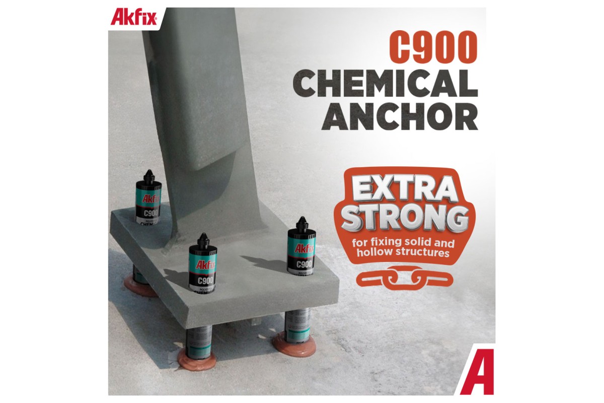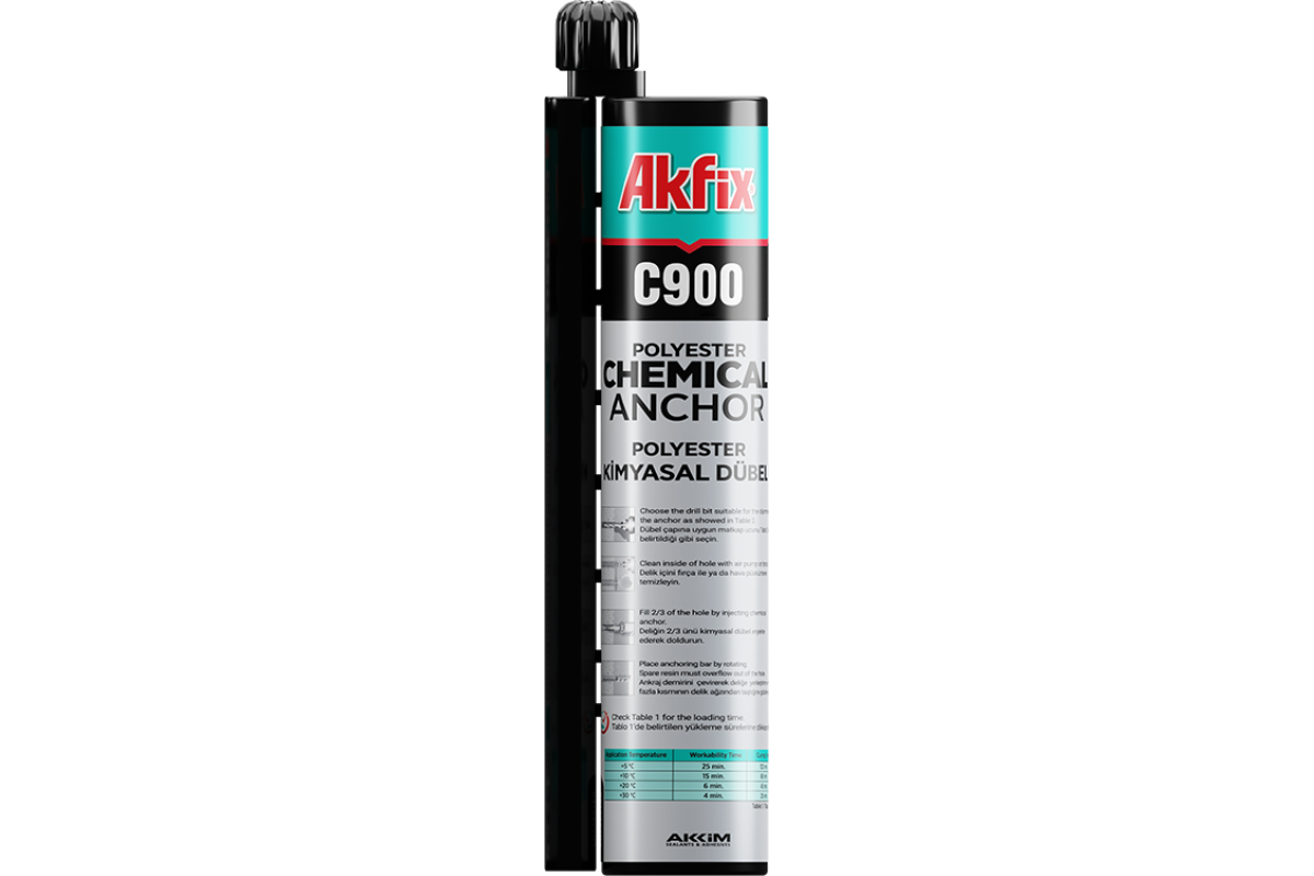Akfix C900 – tai poliesterio pagrindo injekciniai skiediniai, skirti universaliam naudojimui su kietais ir tuščiaviduriais pagrindais, pasižymintys trumpu kietėjimo laiku. Tinka naudoti betonui, kiaurymėtoms plytoms bei tuščiaviduriams blokeliams įvairiose taikymo srityse.